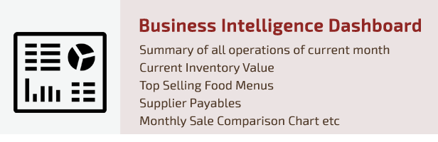 You can call our Dashboard as Business Intelligence Dashboard, it you show you your business at a glance like: Monthly Summary of all operations, your current stock value, your top ten food menus, suppliers due and your montly sale comparison