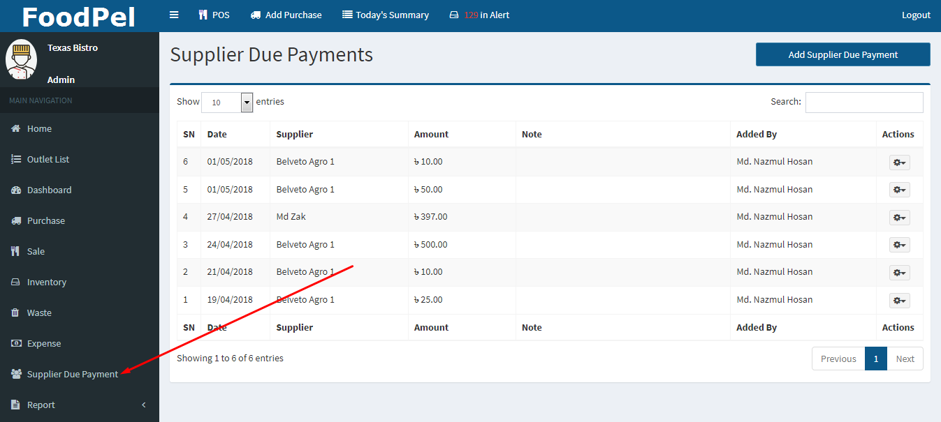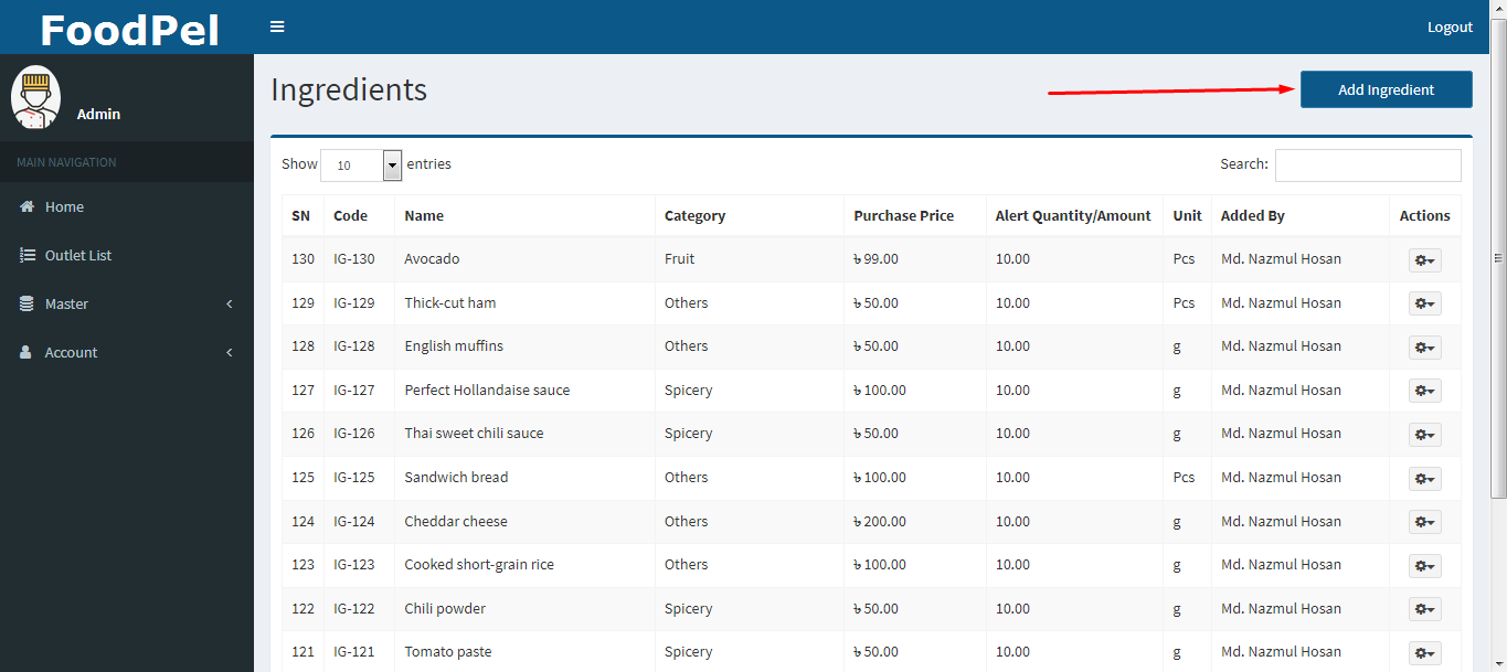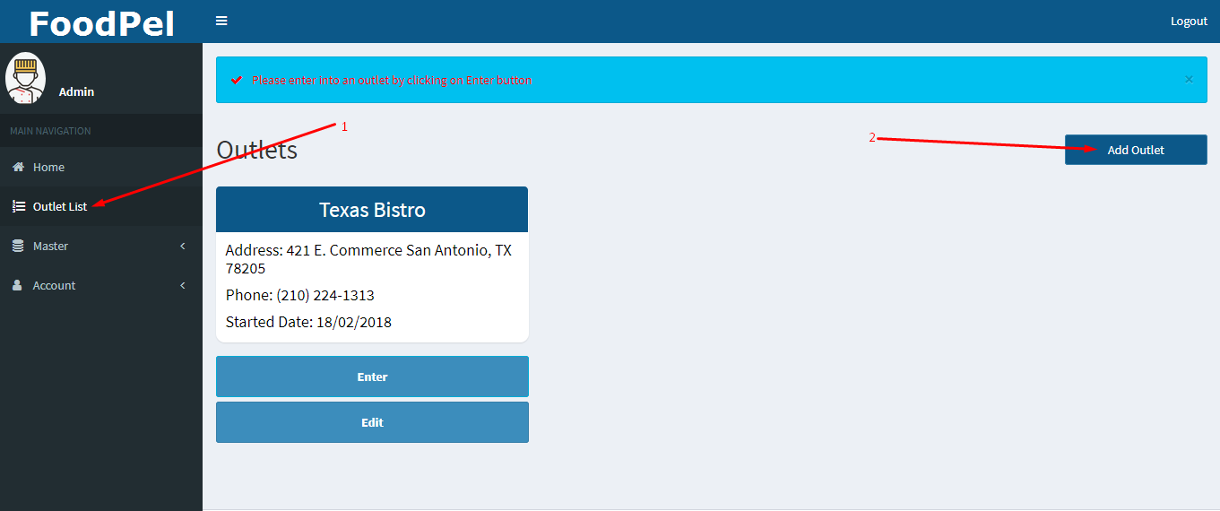 Like purchase, sale, waste, expense, supplier payment, inventory; we are calling these as operations. So to enter information of an operation like you want to put e purchase entry, you have to Enter into an outlet. And every calculation is based on an outlet, so you want to check status of an outlet, you have to enter to that outlet. But for a non-admin user, he will be redirected to an outlet where he is assigned.