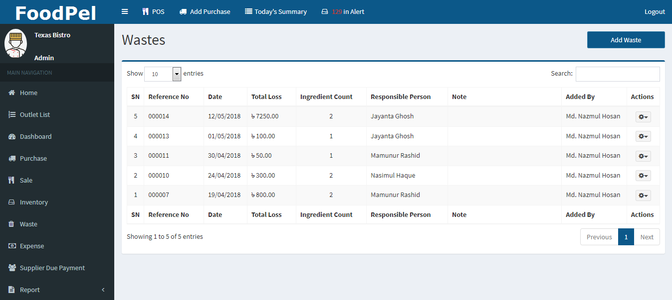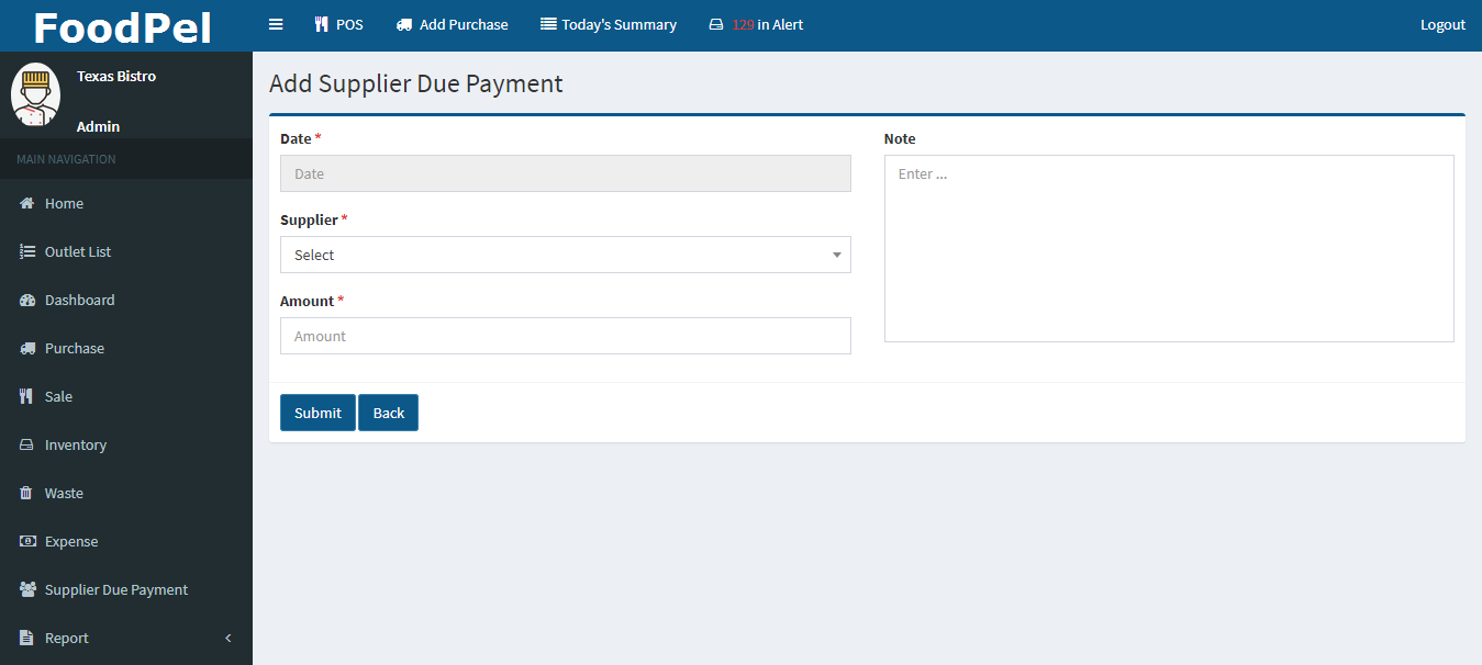 FoodPel is a Restaurant POS Software with Smart Inventory and Multiple Outlet. It has Multiple Store, Profit Loss Analysis, Waste Tracking & Loss Calculation, Smart Inventory, Inventory Alert, Ingredient Purchase, Point Of Sale, Expense Tracking, Supplier Due Payment, KOT with Token No, Table, 15+ Reports, Multi User & Access Control, Device Responsive, Inventory Valuation, Hold Sale, Discount, Tax, Payment Method, Daily Summary and Business Intelligence Dashboard features to run a restaurant very smoothly.