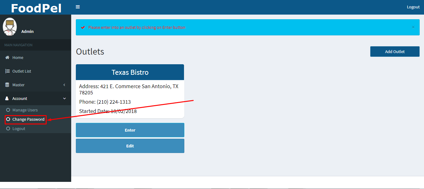 Like purchase, sale, waste, expense, supplier payment, inventory; we are calling these as operations. So to enter information of an operation like you want to put e purchase entry, you have to Enter into an outlet. And every calculation is based on an outlet, so you want to check status of an outlet, you have to enter to that outlet. But for a non-admin user, he will be redirected to an outlet where he is assigned.